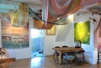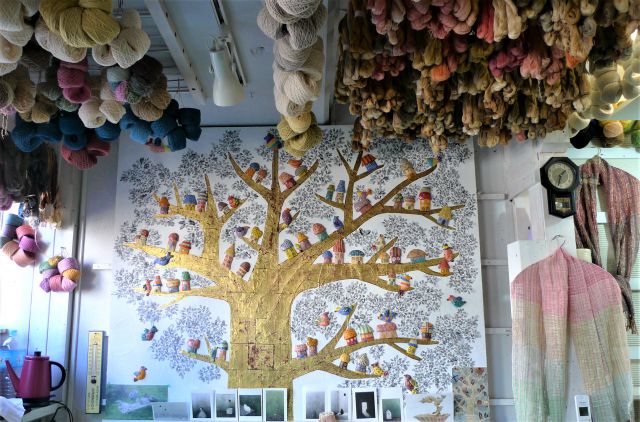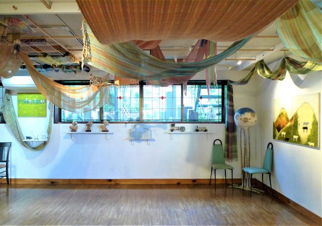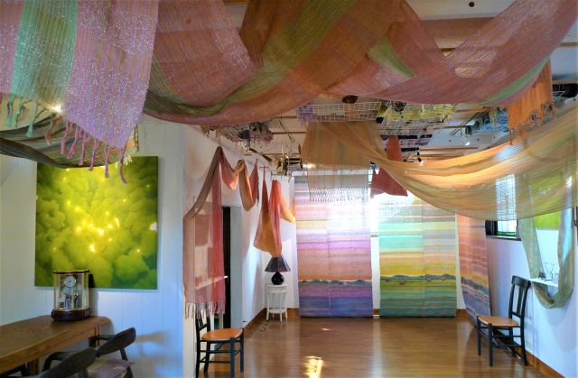壁にある絵を囲むように、天井から吊るした秋色の布たちが不思議な空間を作っています。