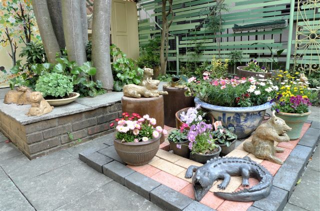 お値打ちなレンガを購入して並べ、鉢植えの草花を乗せると形が出来た。
