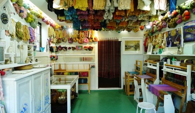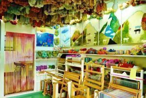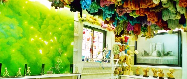自宅アトリエには、ギャラリーから移動した作家たちの作品と染めた糸が同居してとても賑やかです。